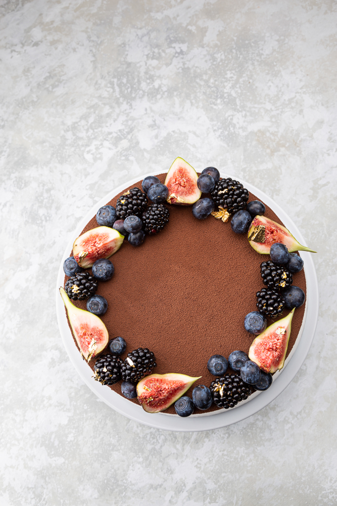 Decorations: blueberries, (wild berries), (figs), chocolate pieces, edible gold